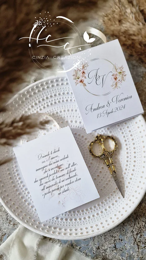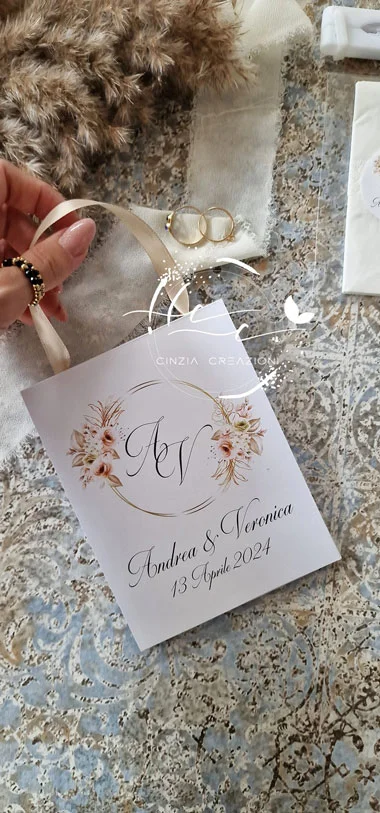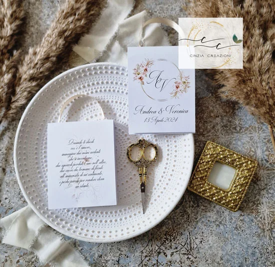 Il tutto con una grafica personalizzata in tema pampas, con una ghirlanda floreale, completa di nomi degli sposi e data del matrimonio.